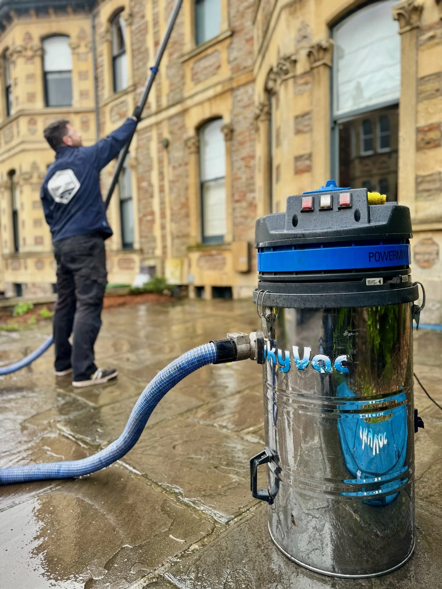 We use an industrial gutter vac that sucks in all the dirt and debris. It is a very powerful tool and clears out the gutters to a very high standard. If there is any problems or the gutter isn’t easily accessible, we climb up a ladder or get up on the roof if possible.